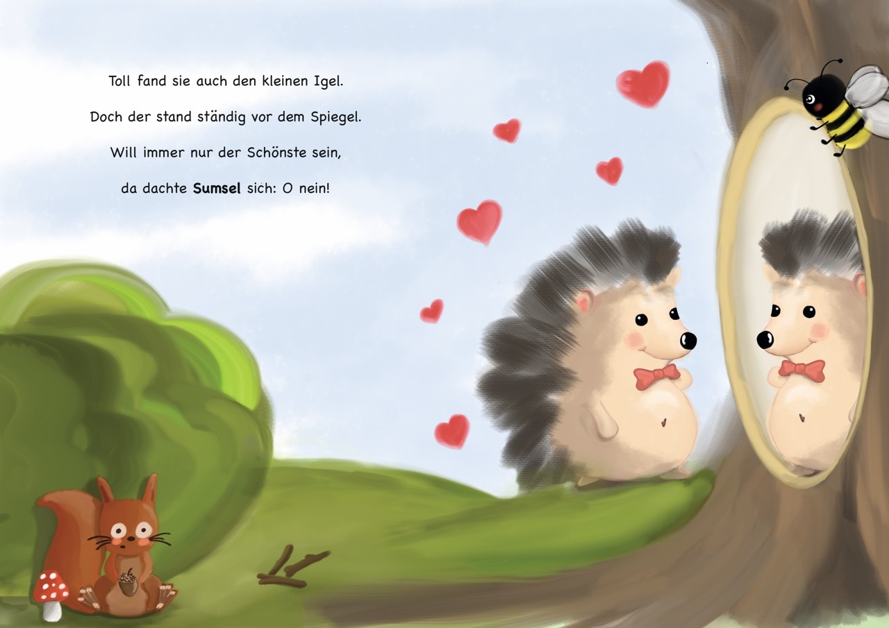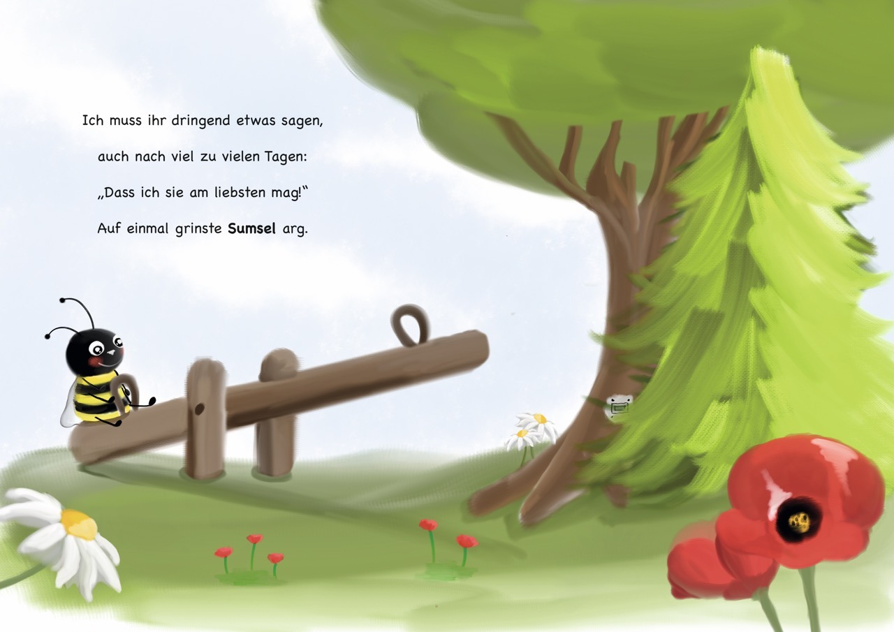 „Die kleine Hummel Sumsel-Brumm fühlt sich allein und hätte so gern einen richtigen Freund. Leider weiß sie nicht, wo man diesen findet. Auf einmal fällt ihr ein, dass es da doch vor einiger Zeit schon mal jemanden gab…“